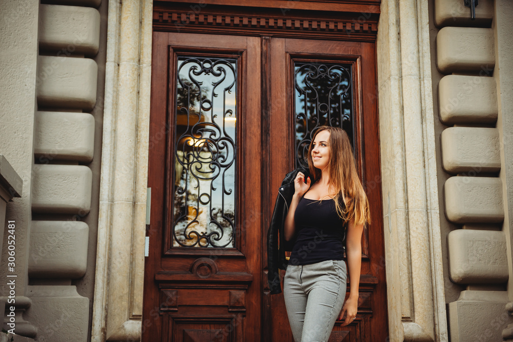 Outdoor portrait of young woman wearing checked trousers, leather jacket draped over the shoulder