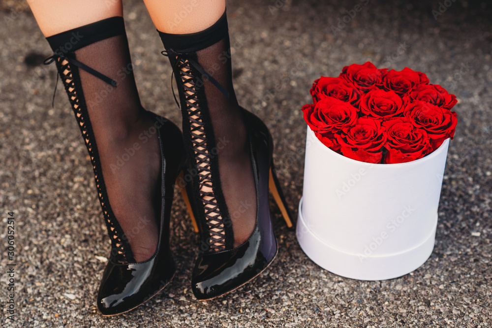 Image of woman's legs wearing black high heel shoes and socks next to white box with red roses