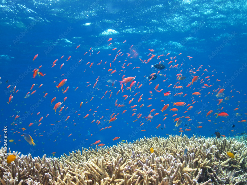 沖縄 サンゴ礁とカラフルな熱帯魚