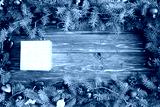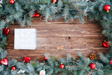 Old wood background with fir branches. Holiday Gifts. Christmas card. Top view.
