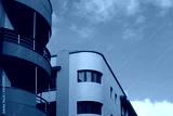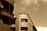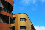 Architectural details of orange and yellow contemporary apartment buildings against blue sky (Tenerife, Spain)