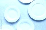 Top view of the white empty ceramic plates on linen tablecloth with copy space. Preparation to the table setting. Concept food table serving.