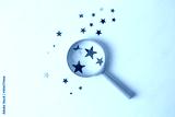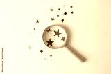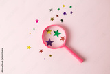 Top view of magnifier and different sizes multicolored stars on pastel rose background abstract.