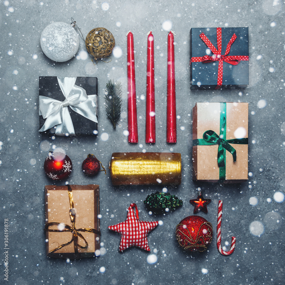 Christmas Gift Boxes And Baubles Collection In Grey Background With Snow, Top View. New Year Holidays Wrapping Ideas Concept