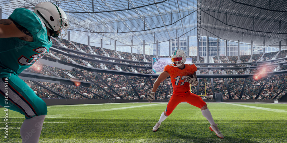 American football players in professional stadium.