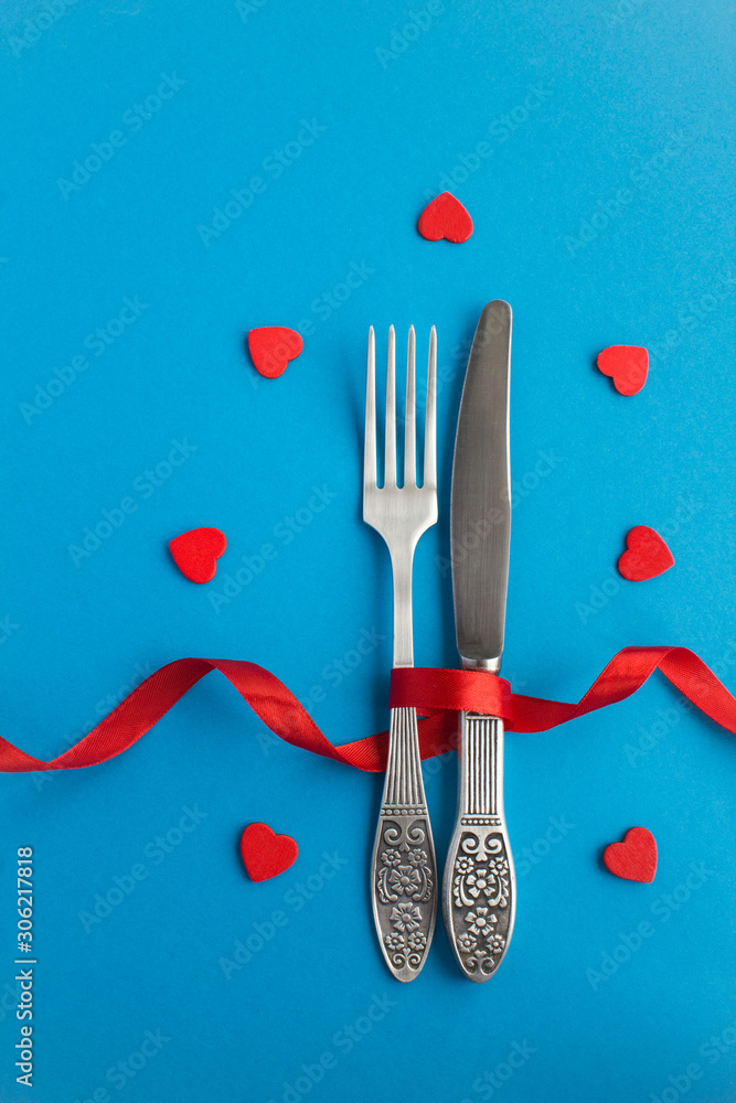 Festive table setting with red ribbon and hearts on the blue background. Top view. Copy space. Location vertical.