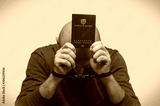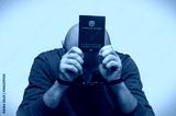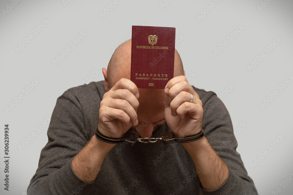 The problem of illegal immigration refugees Colombia, Colombian immigrant handcuffed with a passport in his hands. Illegal border crossing, the violator is detained.