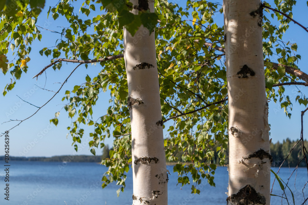 Birch trees sunny day near lake in finland nice nature nordic finnish landscape wild daylight background