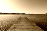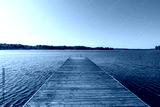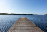 Wooden swimming dock pier with metal ladder on calm blue lake sunny day on nature finland idyllic natural resort