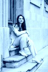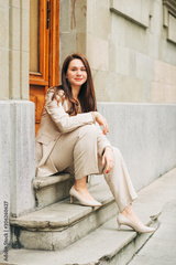 Outdoor portrait of beautiful woman posing on the city street, sitting on stairs, wearing beige suit