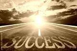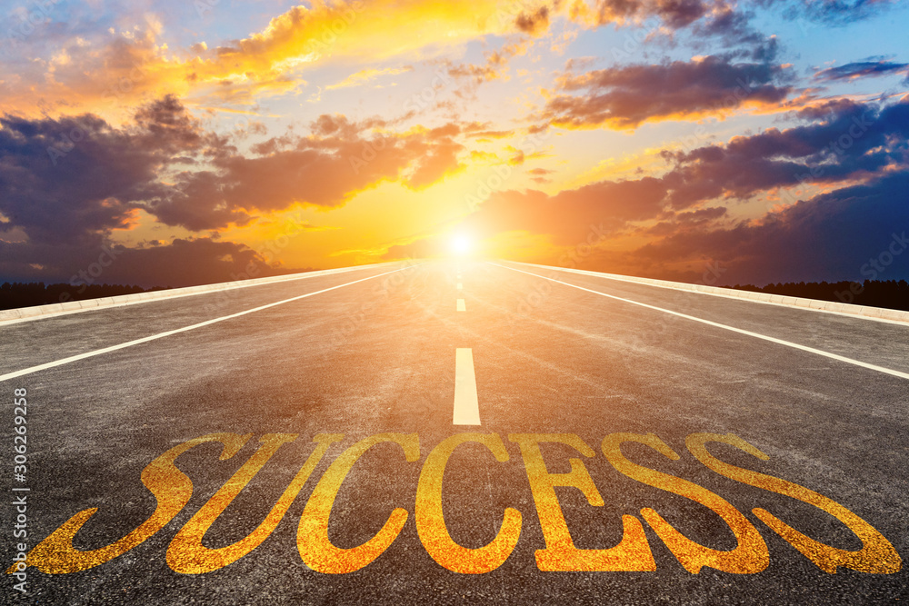 Write "success" on the empty asphalt road straight ahead. Creative drawings of successful concepts.