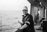 Marine Deck Officer or Chief mate on deck of offshore vessel or ship , wearing PPE personal protective equipment - helmet, coverall. He holds VHF walkie-talkie radio in hands.