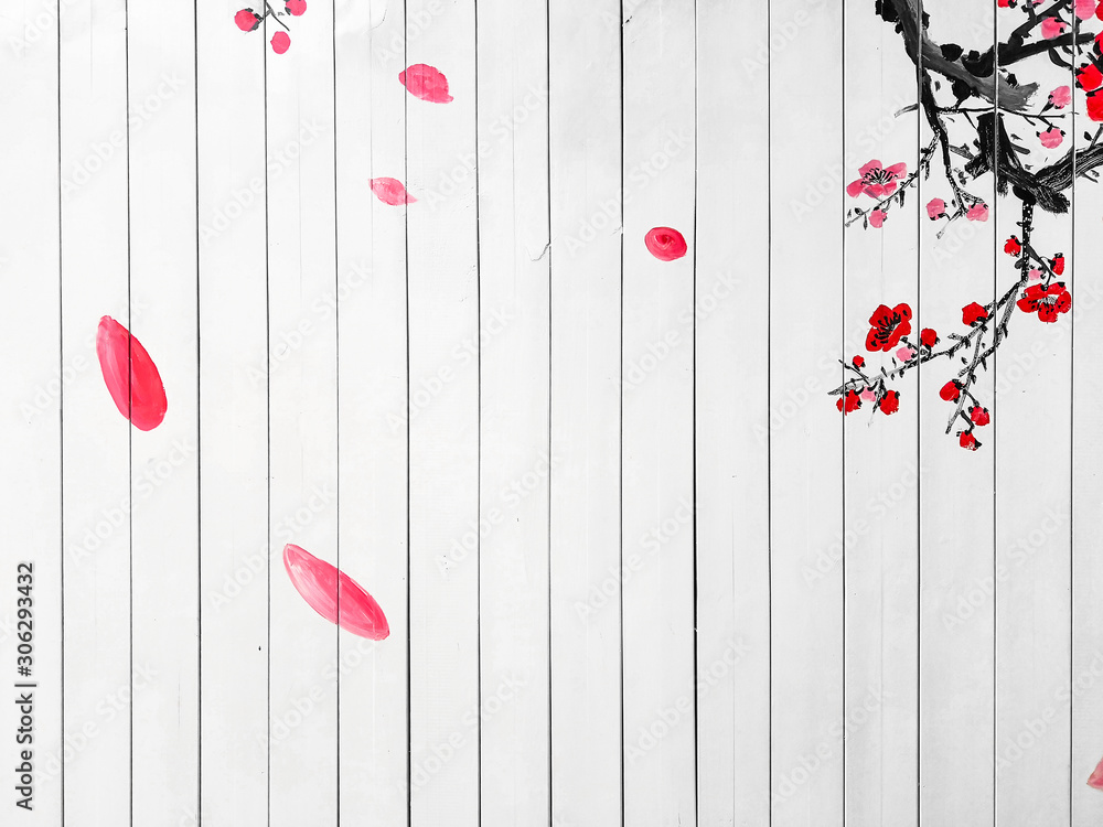 Chinese ink paintings of plum blossoms are painted on white wooden board