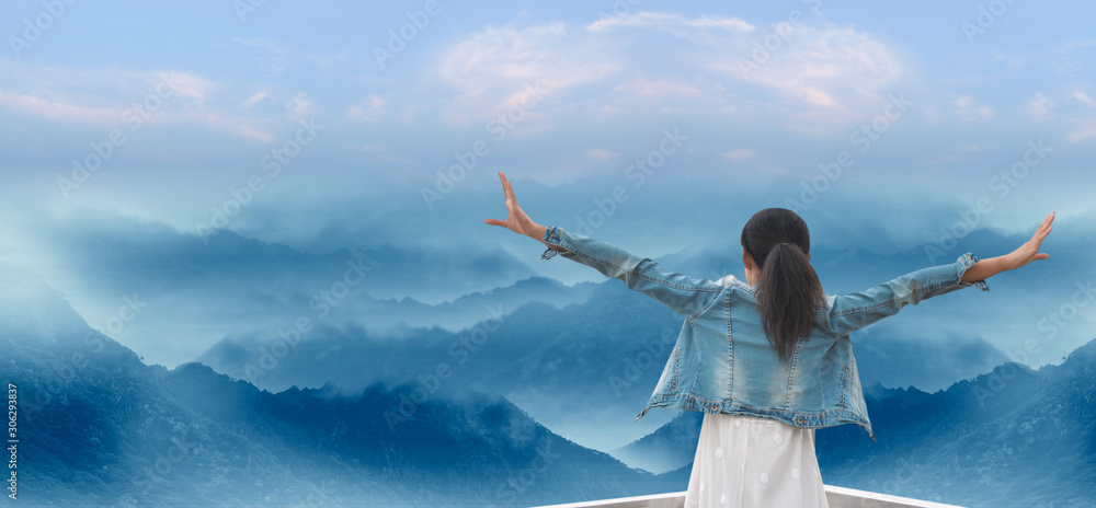"Shouted a young woman in jeans and a skirt, holding out her hands in front of a high mountain