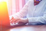 The businesswoman USES a laptop in her office