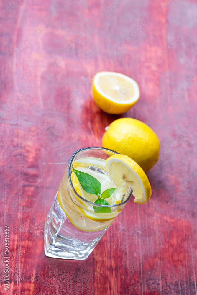 A glass of lemonade and cut lemon on a red table