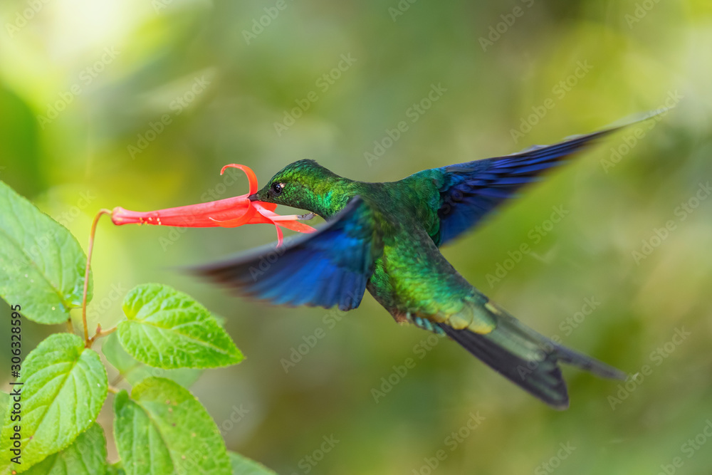 Great Sapphirewing - Pterophanes cyanopterus, beautiful large hummingbird with blue wings from Andean slopes of South America, Yanacocha, Ecuador.