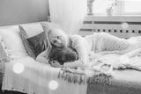 Happy blonde girl lying on a bed near window.