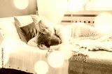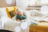 Young beautiful blonde girl in a white sweater with pleasure sleeps in bedroom