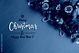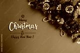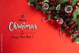 Christmas background concept. Top view of Christmas gift box red balls with spruce branches, pine cones, red berries star and bell on red background.