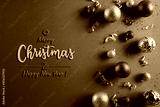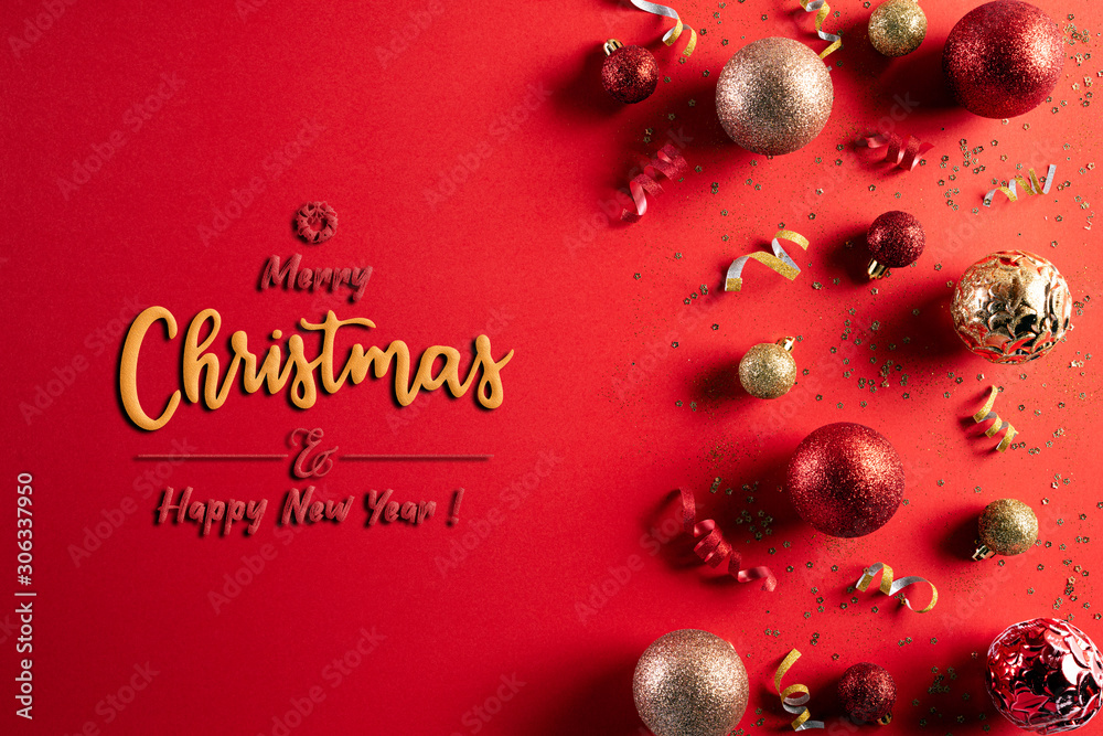 Christmas background concept. Top view of Christmas red and golden ball with snowflakes on light red pastel background.