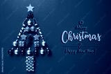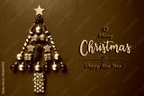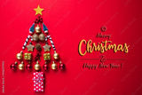 Christmas background concept. Top view of gift box with red ball and bell in shape of Christmas tree on red background.