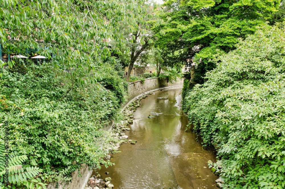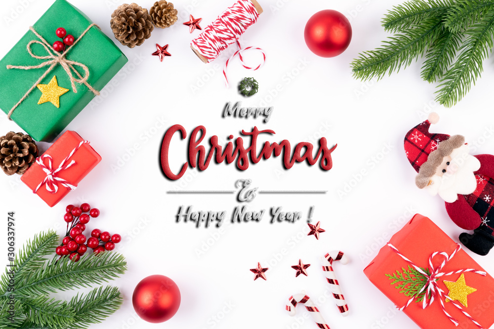 Christmas background concept. Top view of Christmas green and red gift box with spruce branches, pine cones, red berries and bell on white background.