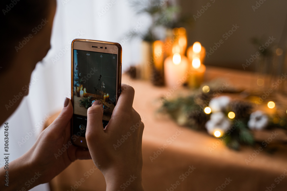 Woman making photo with her phone for social media. Christmas content. Blogger