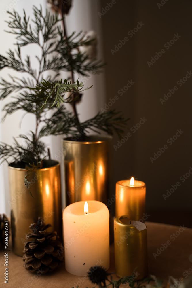 Home hygge with golgen candles and pine trees. Christmas time. Lifestyle cozy home
