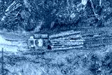 Lumber being transported along a muddy track by heavy machinery. Aerial view