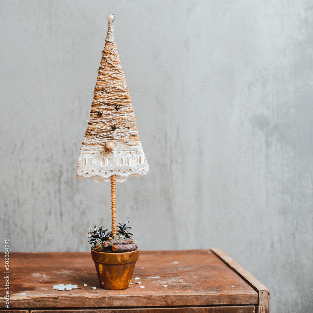 Textile Christmas tree in a pot handmade. Concrete grey background. Needlework new year decorations. Christmas decorations with your own hands. Free space for text.