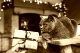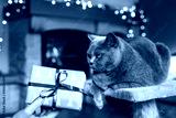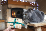 Woman giving gift box to her british shorthair cat. Enjoying christmas holiday