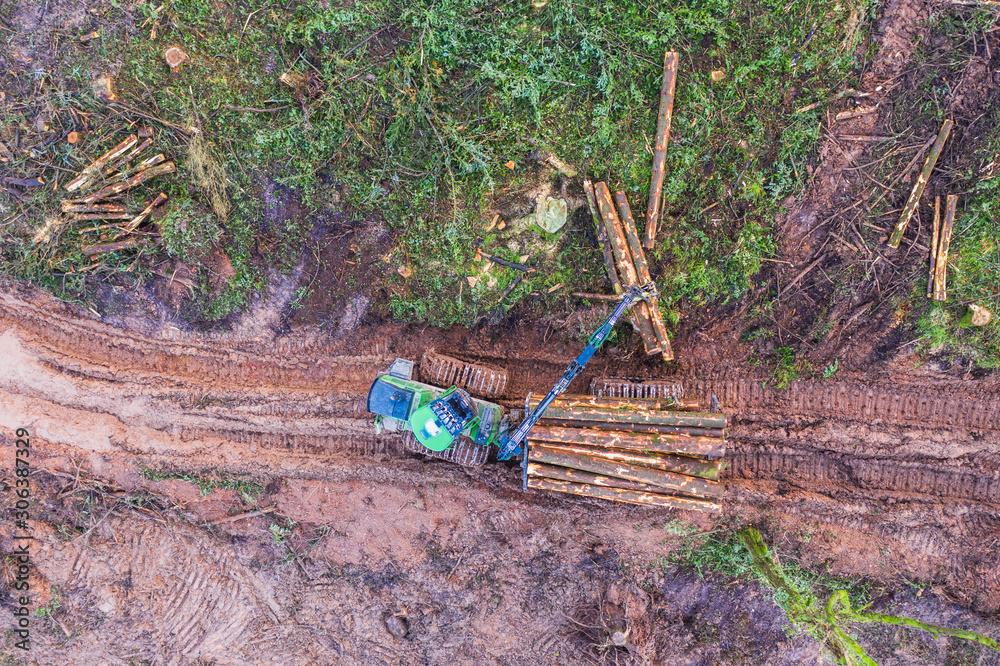 Lumber being transported along a muddy track by heavy machinery. Aerial view