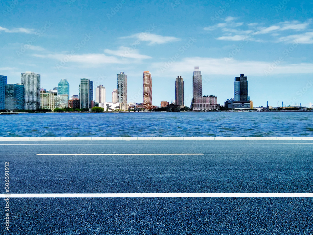 The Hudson River skyline in Manhattan is combined with asphalt road in the United States