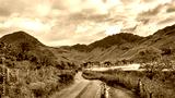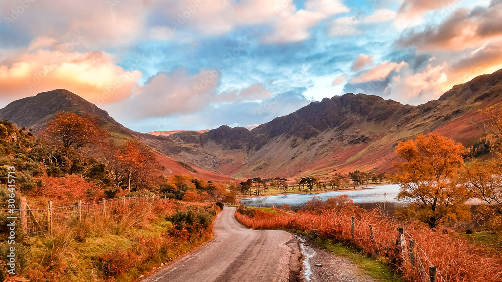 Buttermere lake in the Lake District in autumn on a scenic curvy road near Newlands Pass and Honister pass overlooking the valley surrounded by mountains in Cumbria, England.