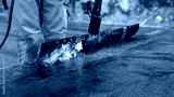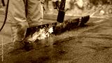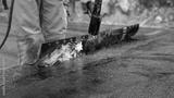 CLOSE UP: Laborer lays black tar insulation over the building's foundation