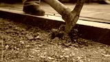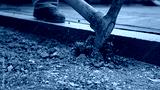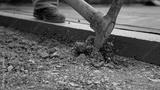 CLOSE UP: Unrecognizable worker uses pickaxe to start digging into gravel ground