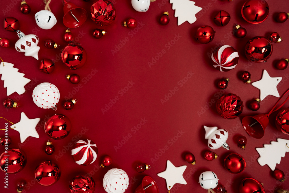 Red Christmas tree toy decoration laid out as a round frame on a red background with copy space. New Year greeting card layout. Minimal style. Flat lay.