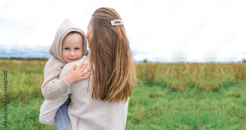 Little boy autumn street, hugs woman mom, emotions help support caring love to his child. Free space copy text. Autumn field background. Warm clothes on cold day, beige cardigan with hood.