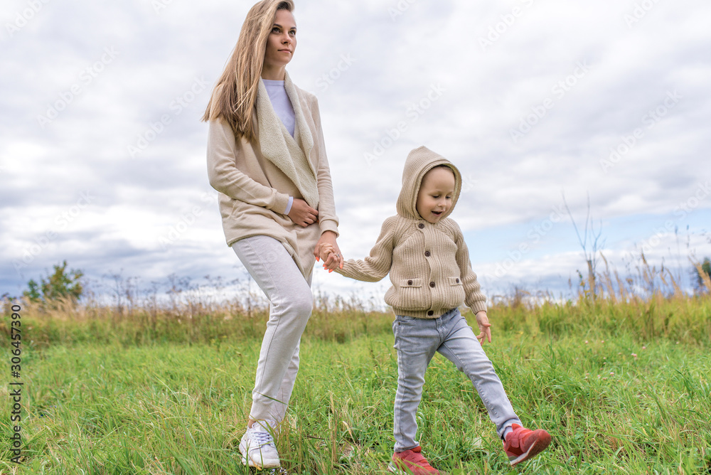 Woman mother walks field, holds hand of little boy son, autumn in city, walk in park, background grass, warm casual clothes, beige cardigan with hood. Cold weather is breeze.