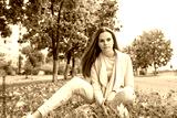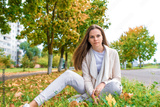 Beautiful woman in autumn sits in leaves, resting and dreaming and fantasizing, warm casual clothes, long hair, background trees road.