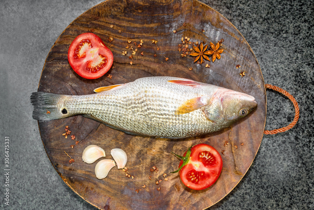 Fresh and clean bass with tomato, garlic, pepper, star anise on the chopping board