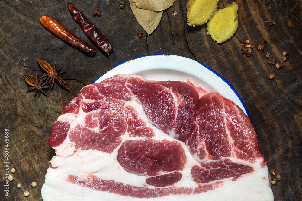 A selection of high-quality pork sits on an old wooden board