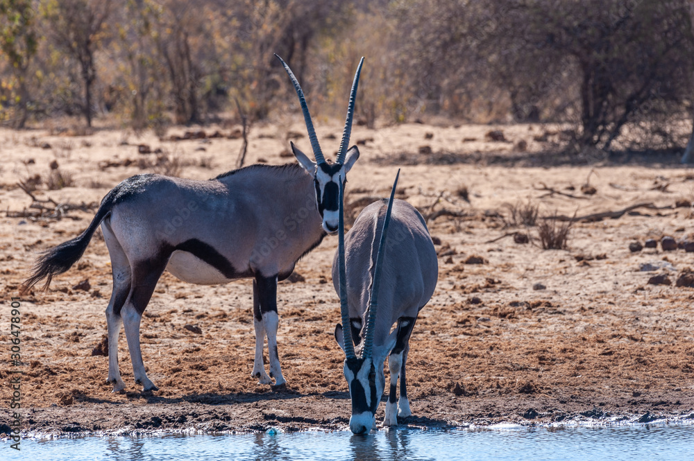 Two Orynx - Oryx gazelle- drinking from a waterhole in Etosha national park, Namibia