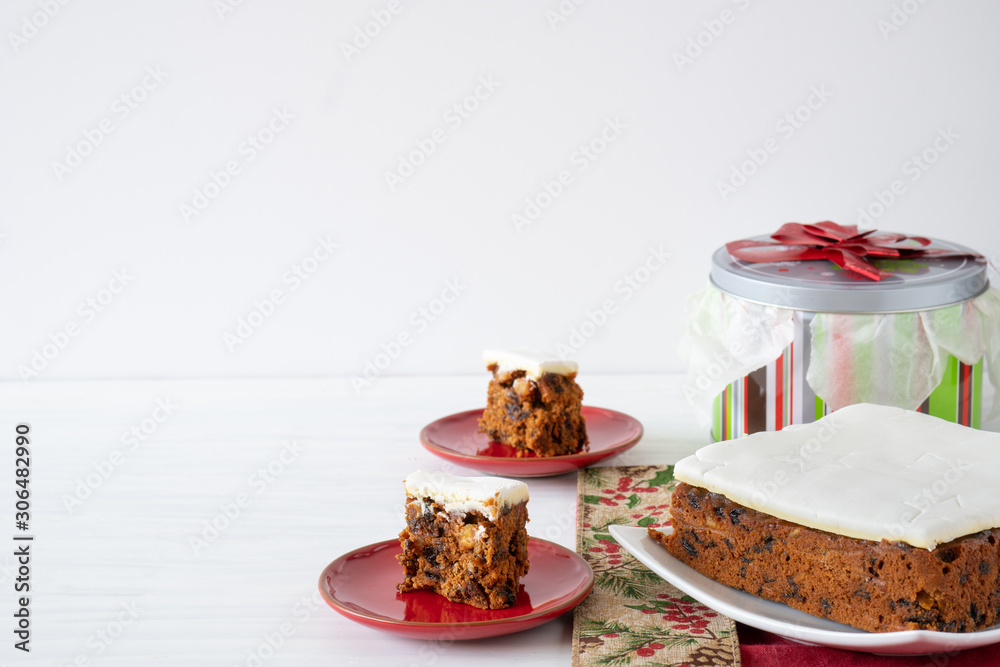 Rich Fruit Christmas Cake on Table with Present on light background with copy space horizontal