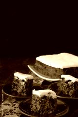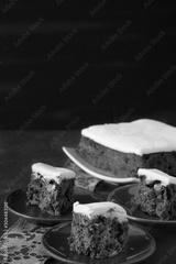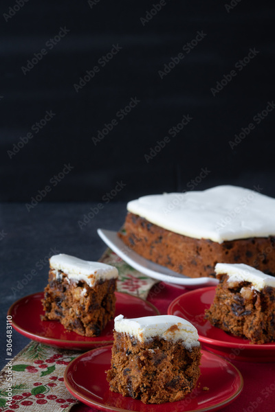 Rich Fruit Christmas Cake on Table with Present on Dark background with copy space Vertical
