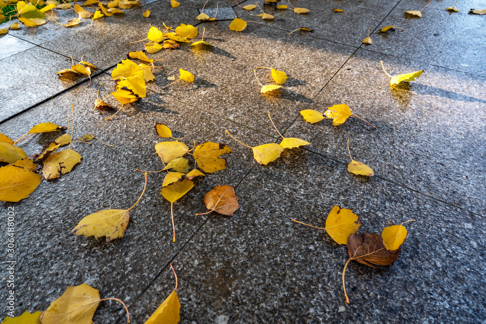 Fallen yellow autumn leaves on paving stone in city park