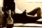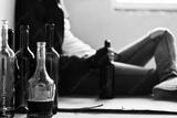Closeup empty glass bottles. On background homeless drunk woman is sitting on cardboard on floor in abandoned house. Addicted teenage girl drunkard is drinking beer. Alcoholism, alcohol abuse concept.