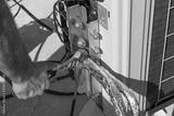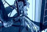 HVAC technician is working on air conditioner units on a roof of new industrial building.Technician hand using fix wrench to tighten outdoor unit of air condition. Man holds a wrench in his hand.