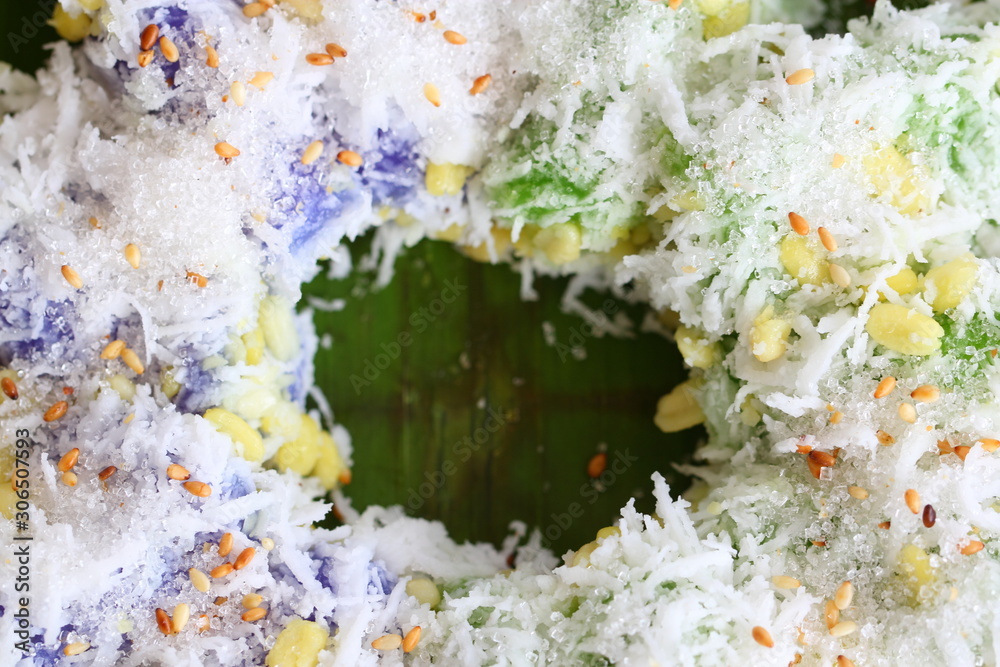 Thai dessert for rituals and eating. Flour stuffed with sweet coconut, and grated coconut topping on plate.